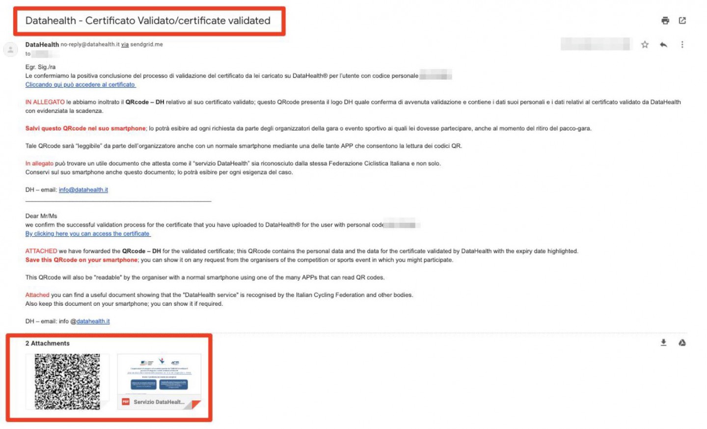 Dopo 24/48 ore riceverete l’esito della verifica del vostro certificato con un QR Code che dovrete portare con voi al momento della manifestazione.